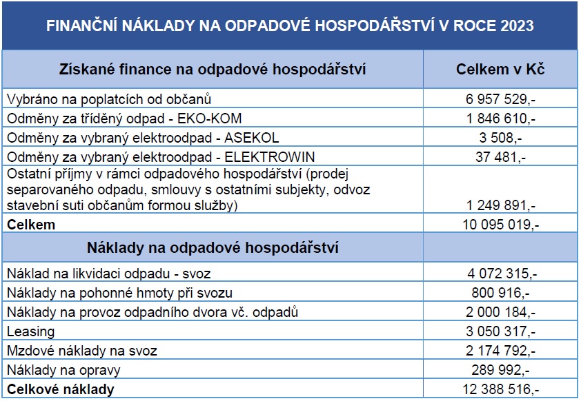 Celková částka za odpadové hospodářství činila v roce 2023 zhruba 12 388 516 Kč. Z této částky se za vybrané poplatky a odměny získané za třídění odpadu zaplatilo pouze 10 095 019 Kč, z čehož tedy město muselo odpadové hospodářství dotovat částkou 2 293 497 Kč z rozpočtu.