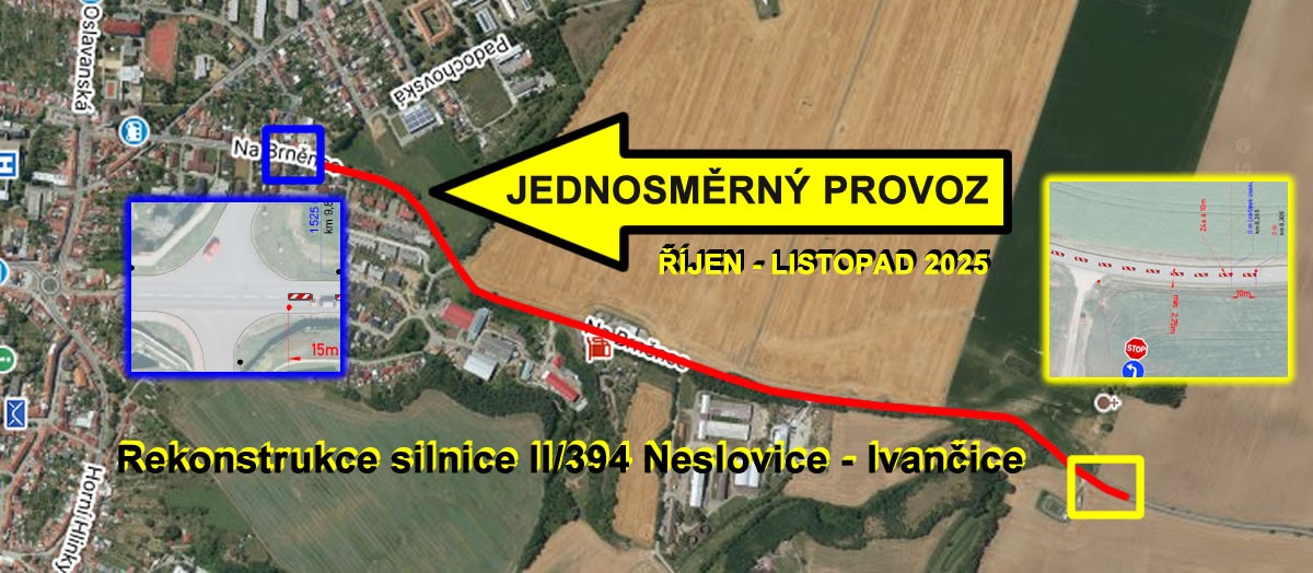 SÚS JmK oznamuje, že od přelomu měsíce září-říjen, případně až od 6. října (v závislosti na podpisu SoD a zajištění povolení uzavírky) zahájí práce na rekonstrukci komunikace II/394 Neslovice – Ivančice, části od provozního staničení km 8,337 -9,842. Bude provedena obnova krytových vrstev a propustku v km 8,537 a sanační práce na mostě. Rekonstrukce bude probíhat za částečné uzavírky.
