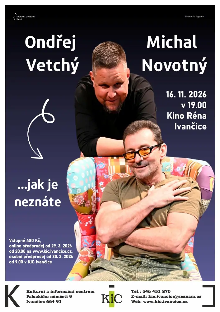 …jak je neznáte: O. Vetchý, M. Novotný Domů / Události / Datum 16. listopadu 2026 Čas 19:00 Kino Réna Palackého náměstí 1013/12 664 91 Ivančice