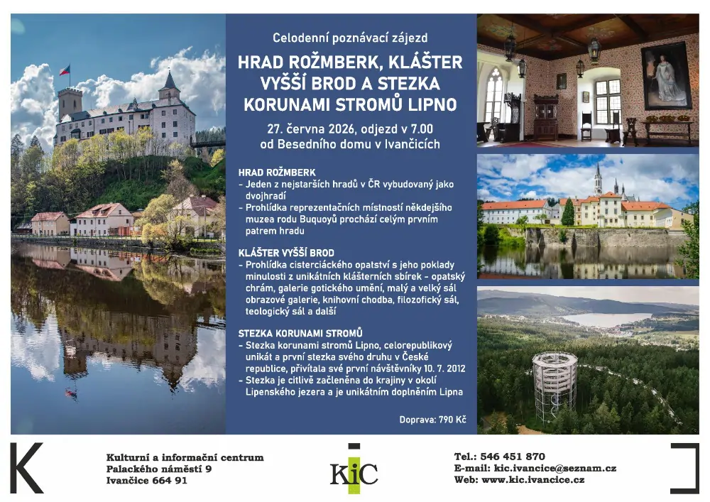 Zájezd: Rožmberk, Vyšší Brod, stezka korunami Lipno Domů / Události / Datum 27. června 2026 Čas Celodenní událost